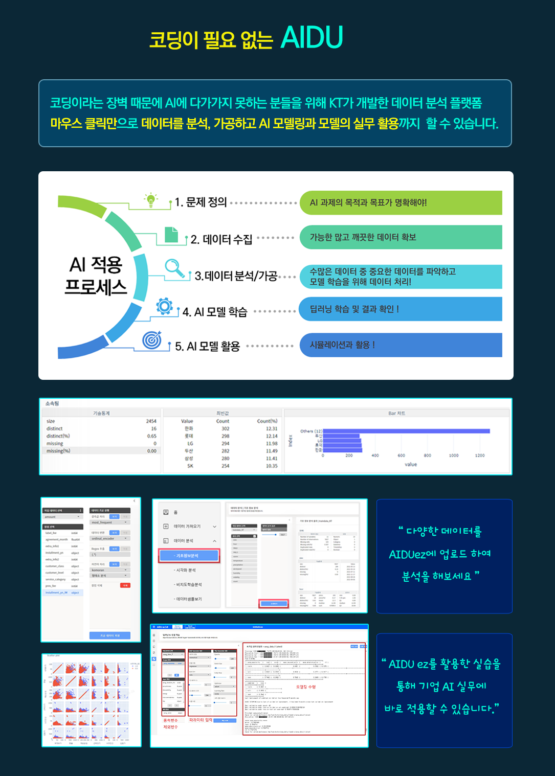● AI를 처음 배우는 분이거나 초보자가 AI의 개념에 대한 전반적인 내용을 익히고 노코드 AI 모델링 플랫폼인 AIDUez로 AI 모델링을 할 수 있다.
